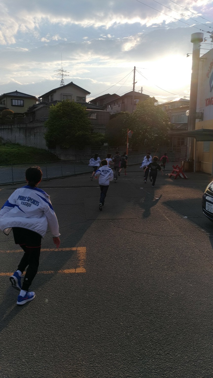 夕日に向かって走れ!プールの練習以外にも陸上でトレーニングをしています。